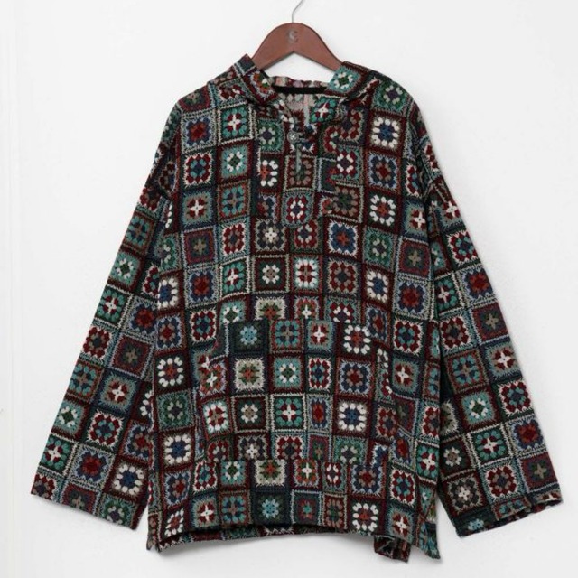 ゴブラン風生地のフード付きメンズトップス。 メタルボタンがアクセントのレトロ感漂う一着。 ゆったりサイズで羽織りとしても活躍。 個性派コーデにぴったり。 サイズ:着丈 75cm 肩幅 70cm 胸囲 140cm 袖丈 52cm カラー:ブラック 素材:ポリエステル80% 綿20% 品番:CAA-6120 注意事項 ※こちらの商品は1点物につき、実店舗でも販売している関係上、万が一の売り切れの際はご容赦ください。 ゴブラン クロシェ フード付き シルクロード エスニック アジアン