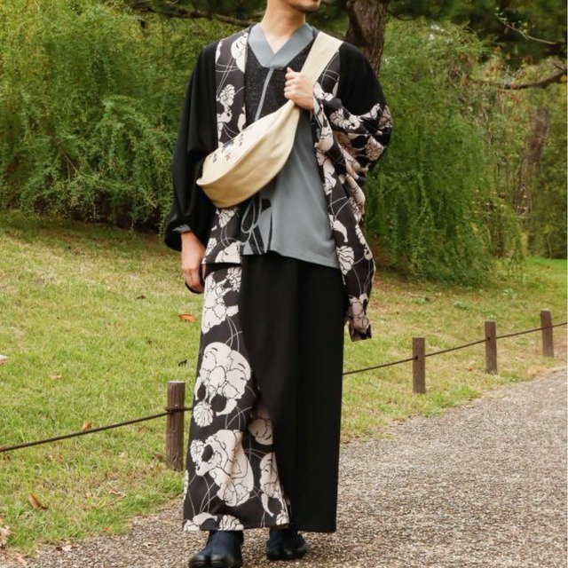 浮世絵の伊達男が着ていた着物柄をモチーフにしたメンズ羽織。 伊達男とは、男振りの良い男性や人目を惹くおしゃれな身なりの男性を意味します。 シワになりにくいポリエステル素材を使用し、ゆったりとした着心地で快適に羽織れる羽織です。 サイズ:着丈 85cm 身幅 146cm 裄丈 73cm カラー:ブラック 素材:ポリエステル95% ポリウレタン5% 品番:7CQ-6105 注意事項 ※こちらの商品は1点物につき、実店舗でも販売している関係上、万が一の売り切れの際はご容赦ください。 ドクロ 髑髏 しゃれこうべ 浮世絵 和洋折衷 倭物や カヤ