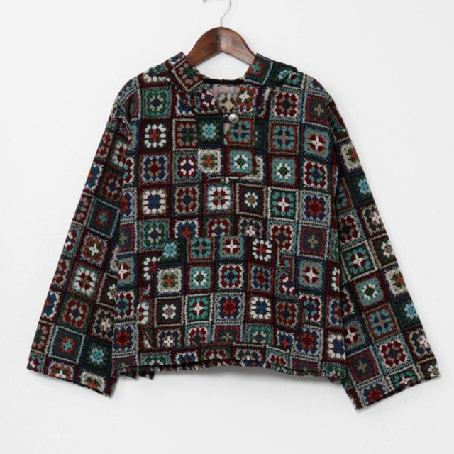 レトロなゴブラン調生地とメタル釦がポイントのフード付きトップス。 コンパクトな丈感でコーデに抜け感をプラス。 サイズ:着丈 58cm 肩幅 53cm 胸囲 131cm 袖丈 49cm カラー:ブラック 素材:ポリエステル80% 綿20% 品番:CAA-6121 注意事項 ※こちらの商品は1点物につき、実店舗でも販売している関係上、万が一の売り切れの際はご容赦ください。 ゴブラン クロシェ フード付き シルクロード エスニック アジアン