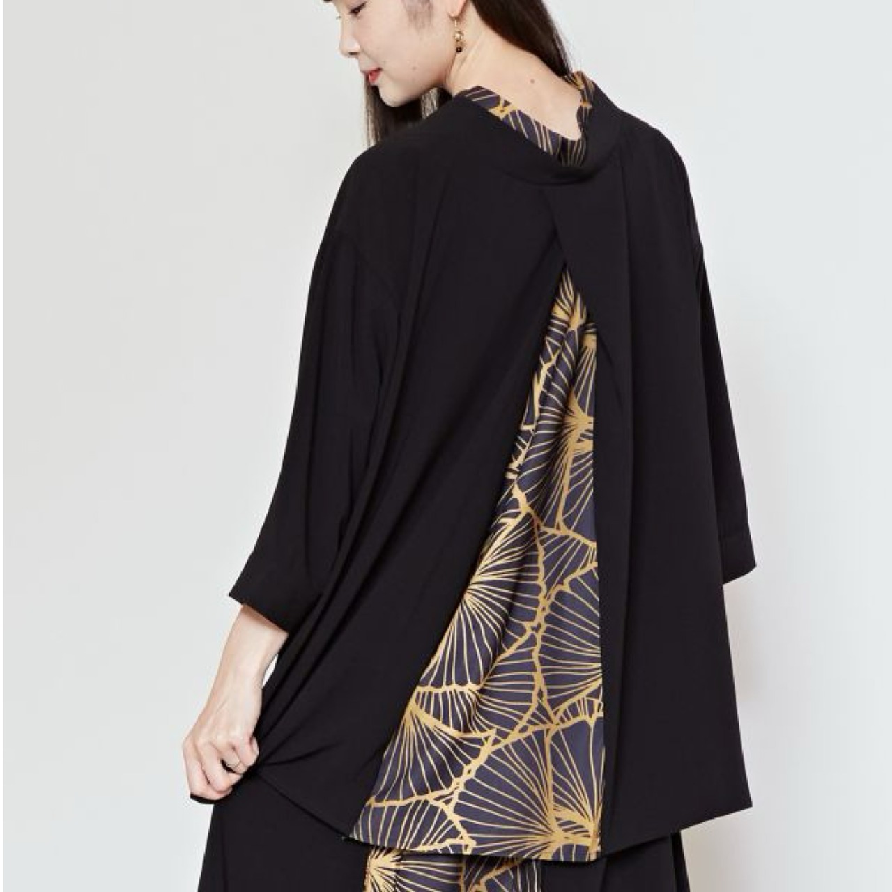 後ろからちらりと覗く柄が、隠れたお洒落を演出。
