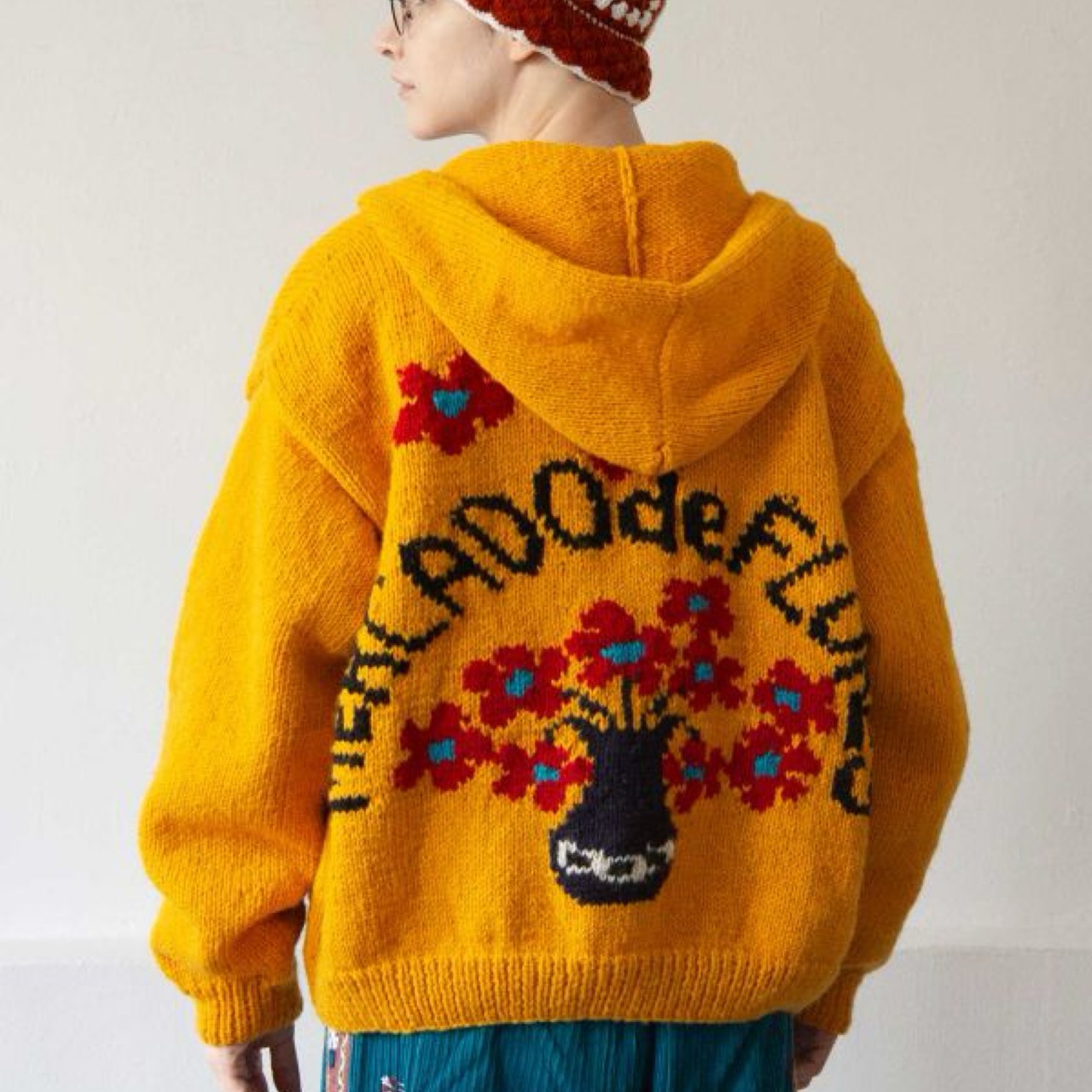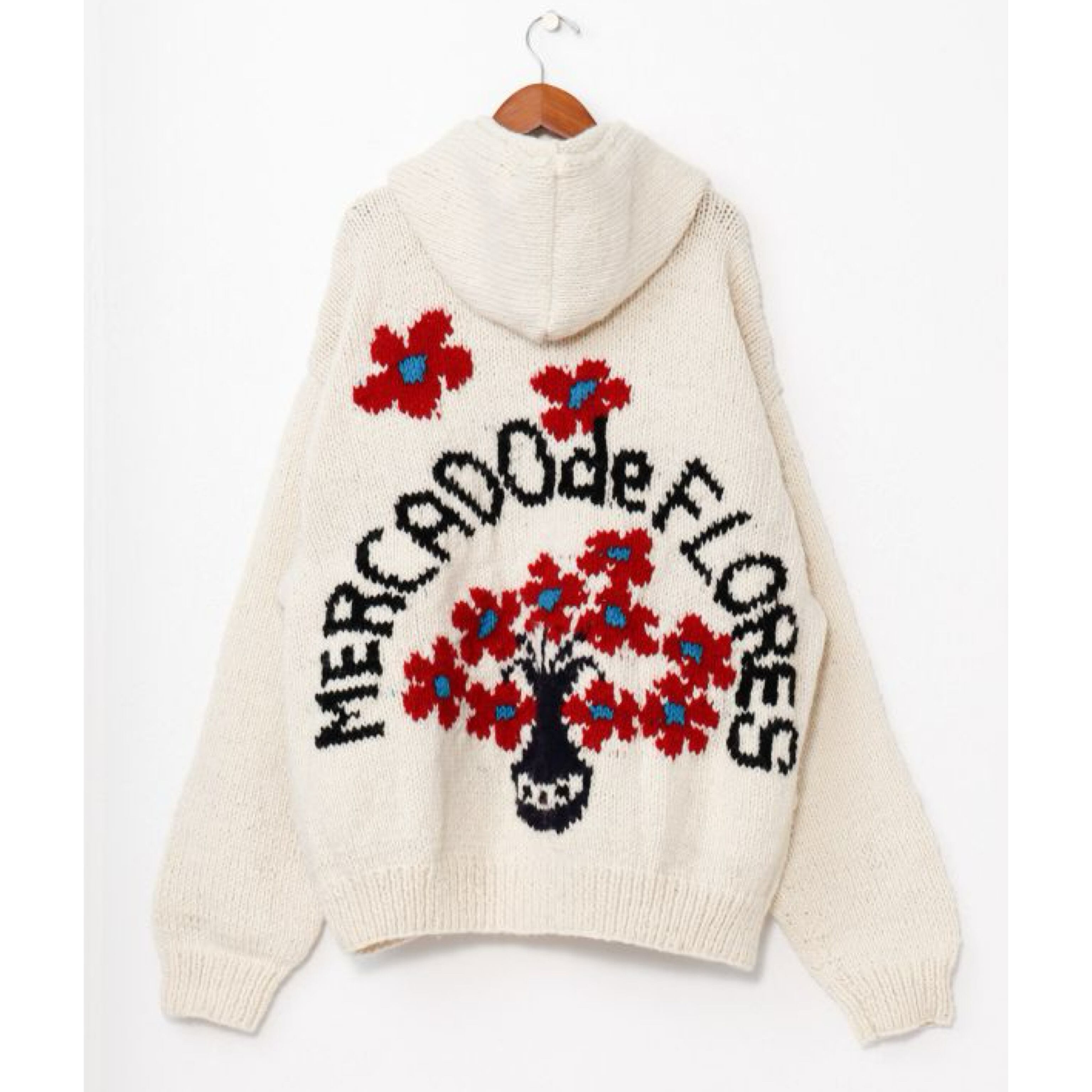 背面に編みこまれている文字「mercado de flores」はフラワーマーケットという意味。