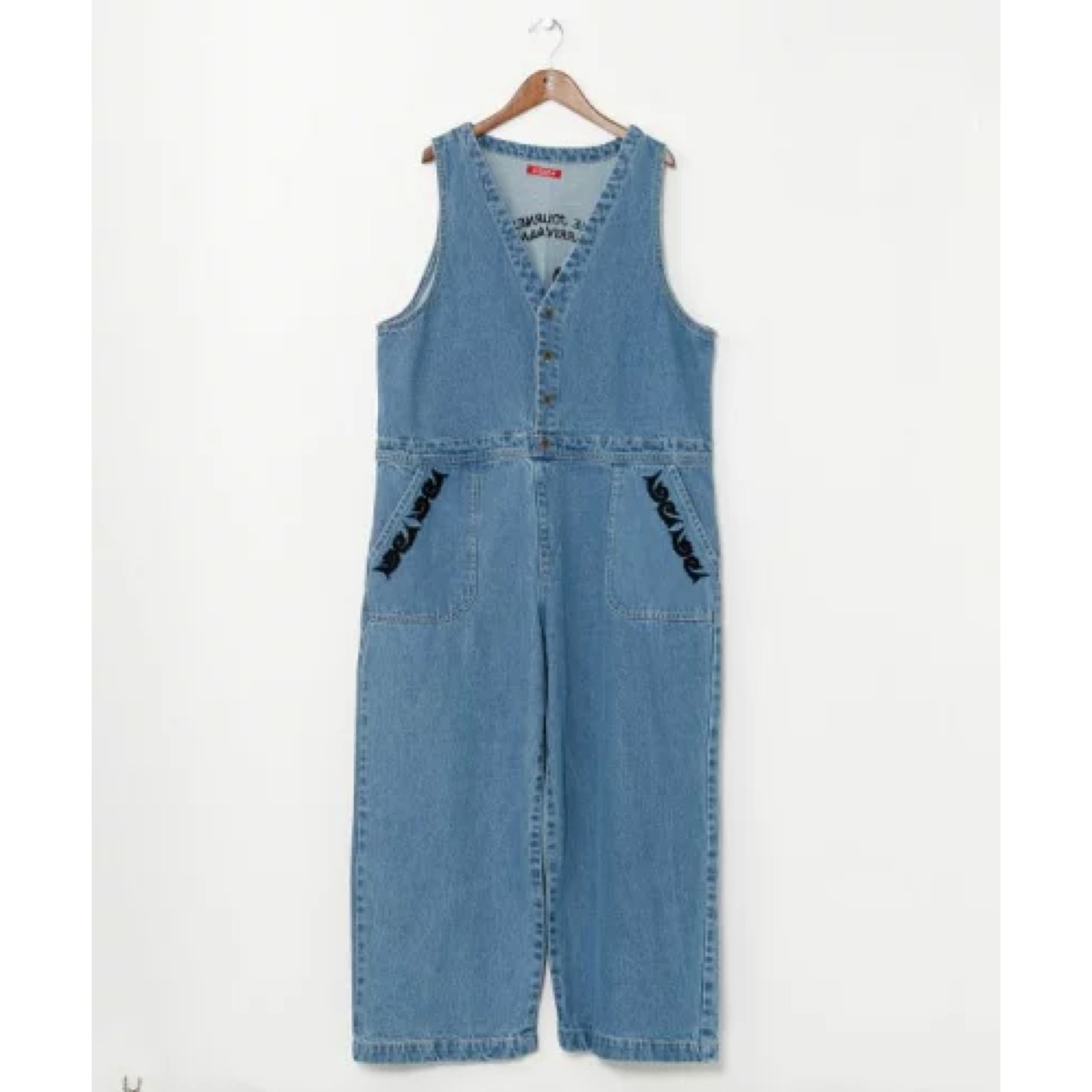 「ウズベキスタンにやってきたカラベラ」がモチーフの刺しゅうが施されたデニムサロペット。