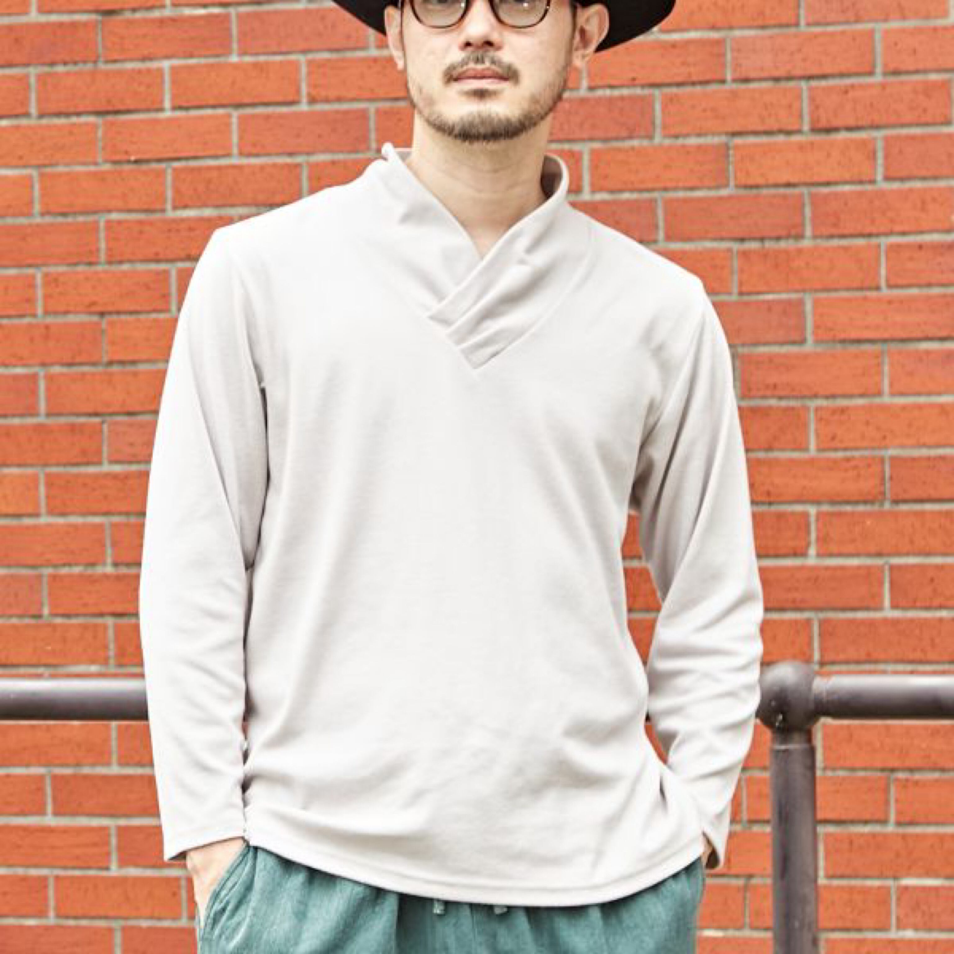 首元が着物のような袷(あわせ)になった、シンプルな色合いの大きめサイズのトップス。