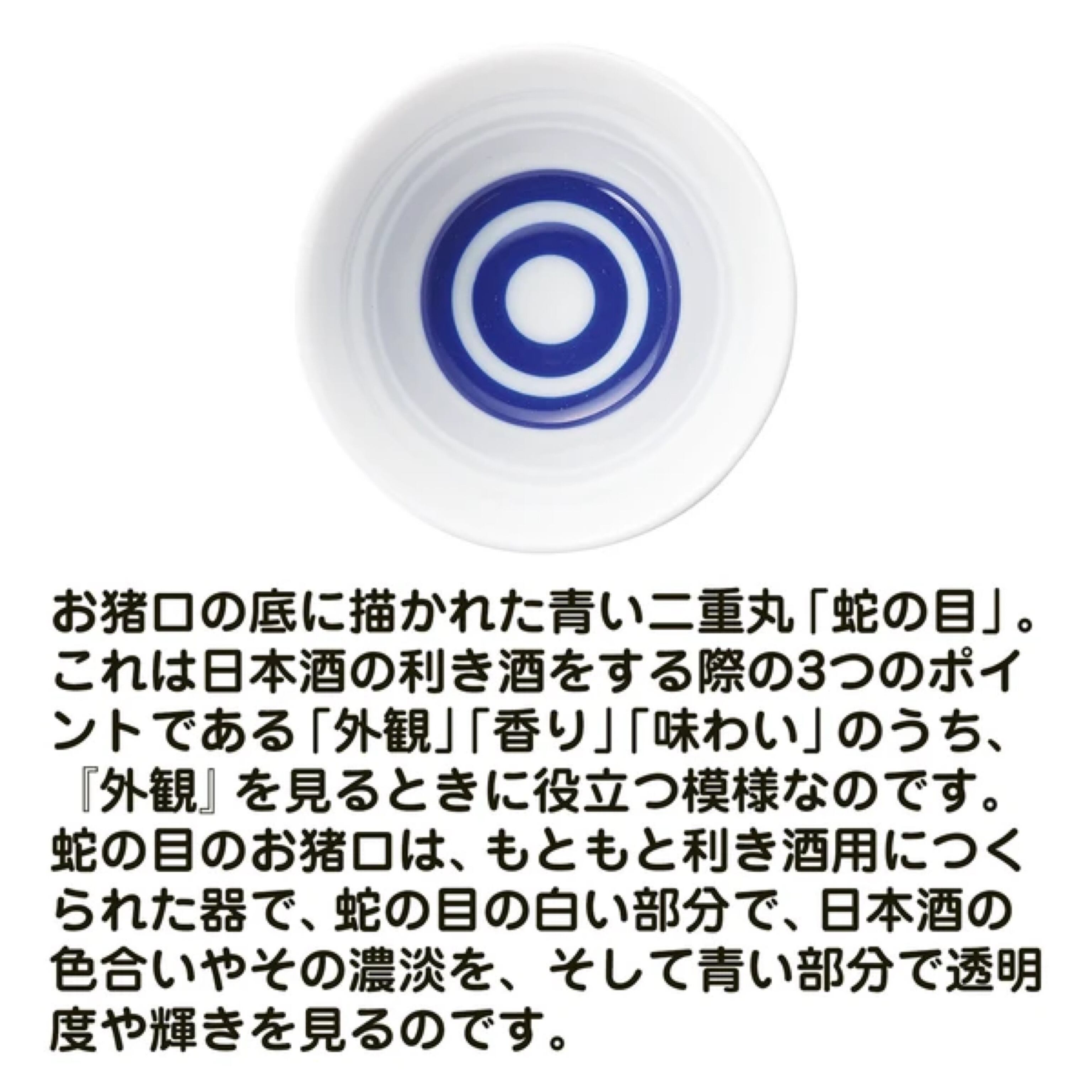 蛇の目のお猪口は、もともと利き酒用につくられた器で、蛇の目の白い部分で、日本酒の色合いやその濃淡を、そして青い部分で透明度や輝きを見るのです。