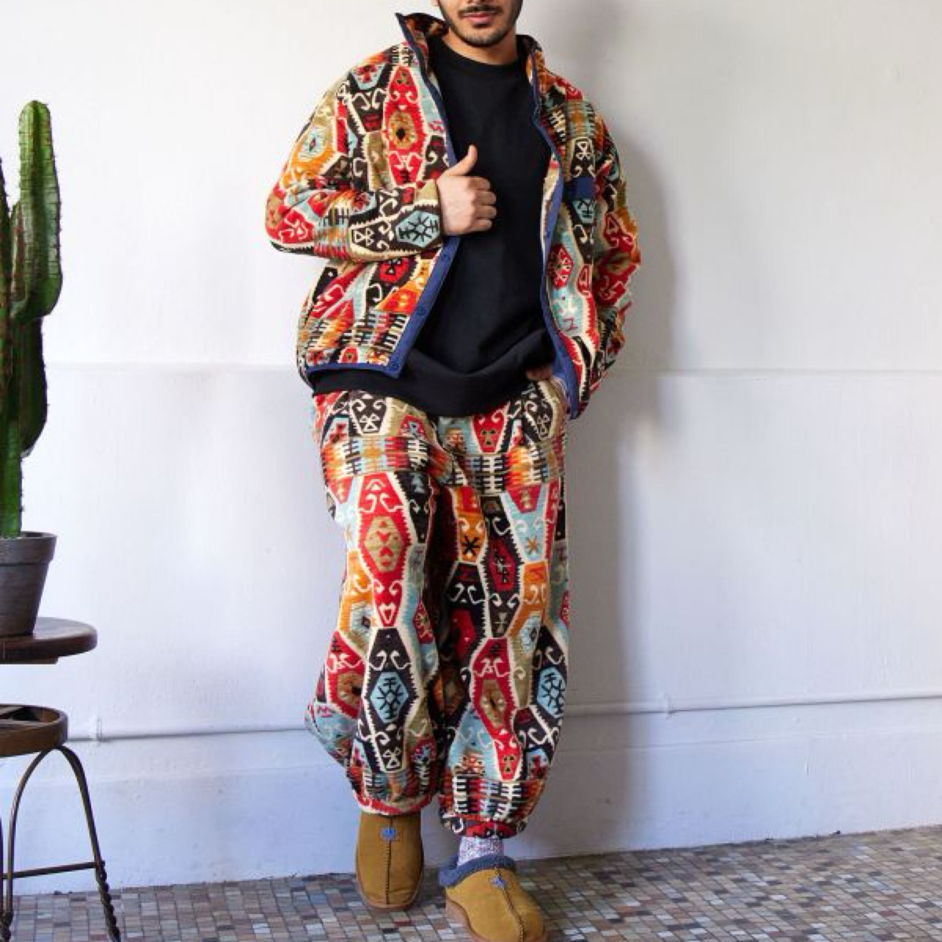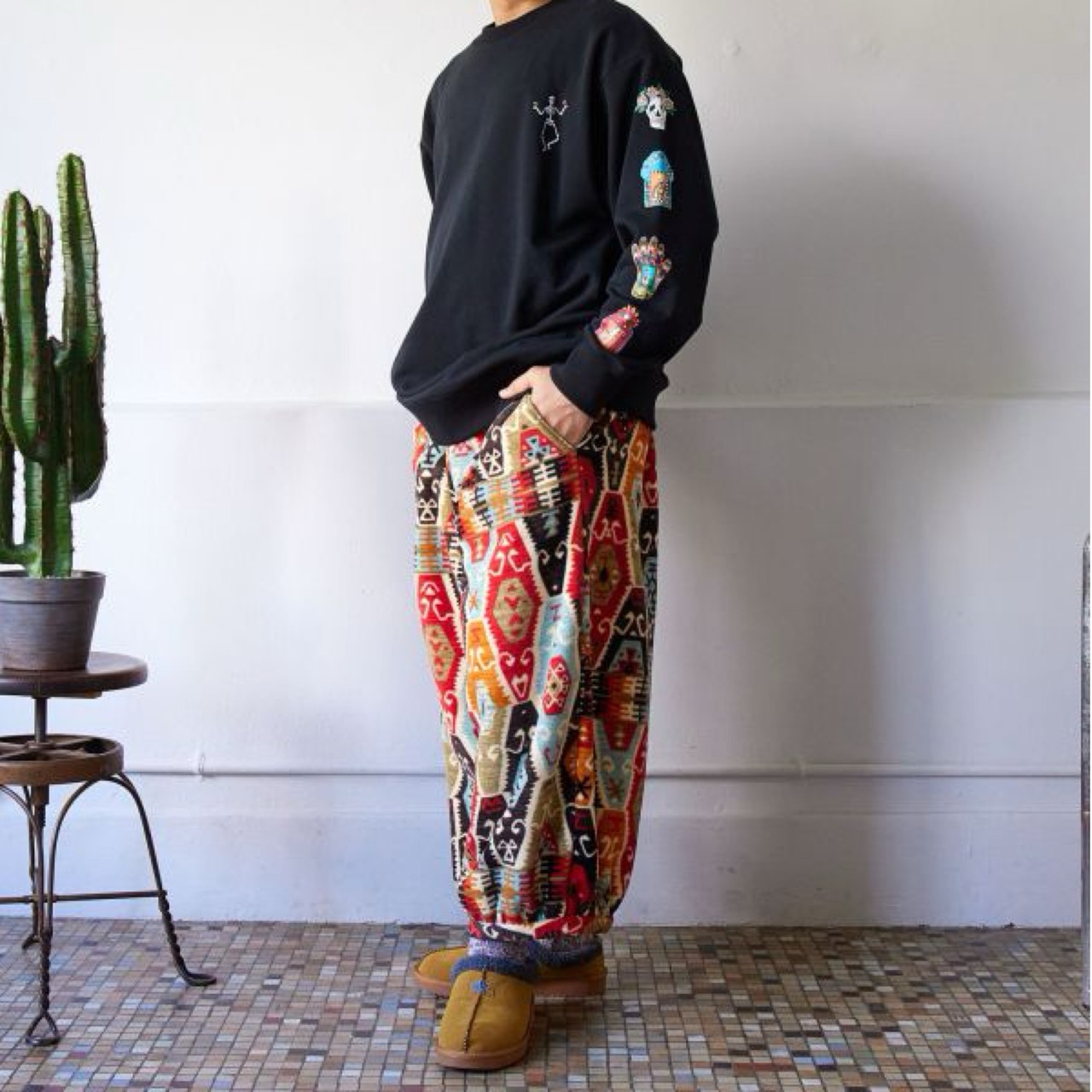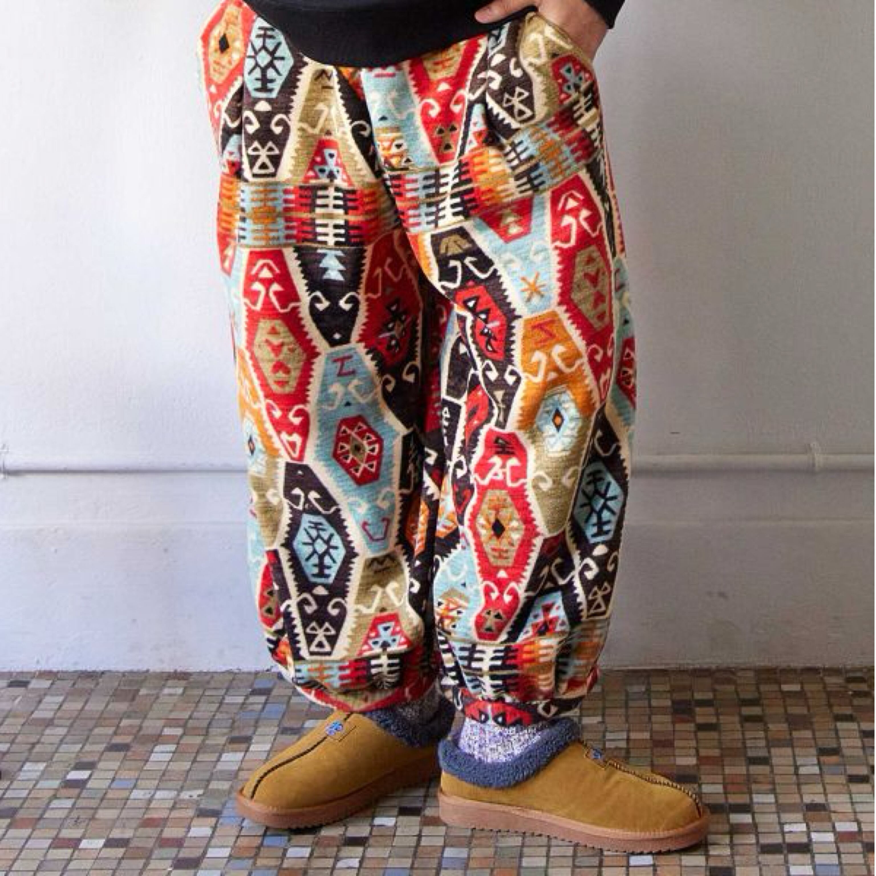 シルクロードにある絨毯や、キリムをモチーフにした総柄メンズパンツ。